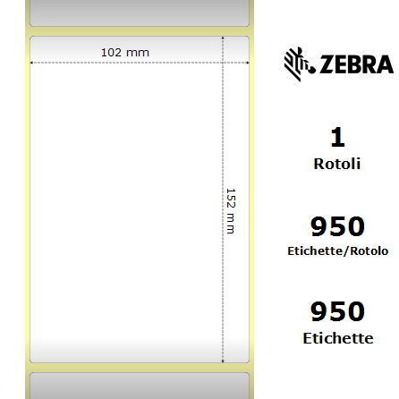 Etichette Zebra a bobina. 1 bobina per confezione. 950 etichette per bobina. Etichette in poliestere con adesivo permanente. Diametro interno: 76 mm. Diametro esterno: 200 mm.