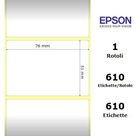 Etichette Epson a bobina. 1 bobina per confezione. 610 etichette per bobina. Etichette in carta con adesivo permanente. Diametro interno: 40 mm. Diametro esterno: 102 mm.