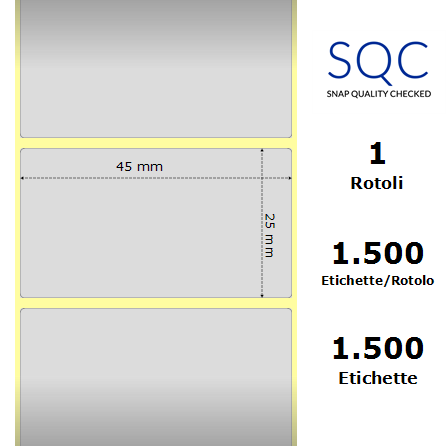 Etichette SQC S-FRICTION Poliestere. Colore argento. 45 mm x 25 mm Etichette SQC a bobina. 1 bobina per confezione. 1500 etichette per bobina. Etichette in poliestere con adesivo permanente. Diametro interno: 45 mm. Diametro esterno: 94 mm. Tipo: Supporto di stampa Confezionamento: Bobina Pezzi per confezione: 1 Etichette per pezzo: 1500 Materiale principale: Poliestere Adesivo: Adesivo permanente Larghezza: 45 mm Altezza\Lunghezza: 25 mm Diametro Interno: 45 mm Diametro Esterno: 94 mm Tecnologia di stampa: Trasferimento Termico Tipologia stampante: Stampanti desktop Applicazione: Etichettatura di lunga durata, Etichettatura in ambienti aggressivi, Etichettatura soggetta ad ambienti umidi, Etichettatura soggetta ad attrito Colore: Argento Piste: 1 Tacca nera: No